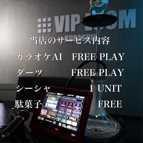 最新AI機器とBOSEの音響機器で音質の良さが自慢のカラオケが歌い放題◎ダーツも無料でプレイでき、テーブルゲームもご利用いただけます♪駄菓子食べ放題も嬉しいポイント!全席喫煙可能で本格シーシャもご堪能いただけます。普段のタバコとの違いをぜひお楽しみください☆